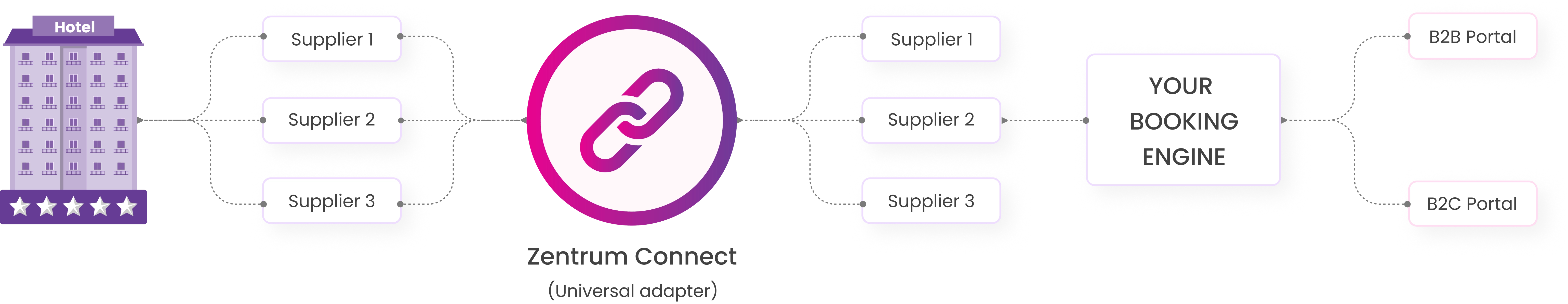 Zentrum Connect is ZentrumHub’s connectivity platform designed specifically for OTAs and bedbanks with existing booking engines. Unlike standard APIs that require rebuilding your system, Zentrum Connect integrates seamlessly with your current infrastructure through a one-time integration, instantly expanding your supplier network without disrupting your existing operations.